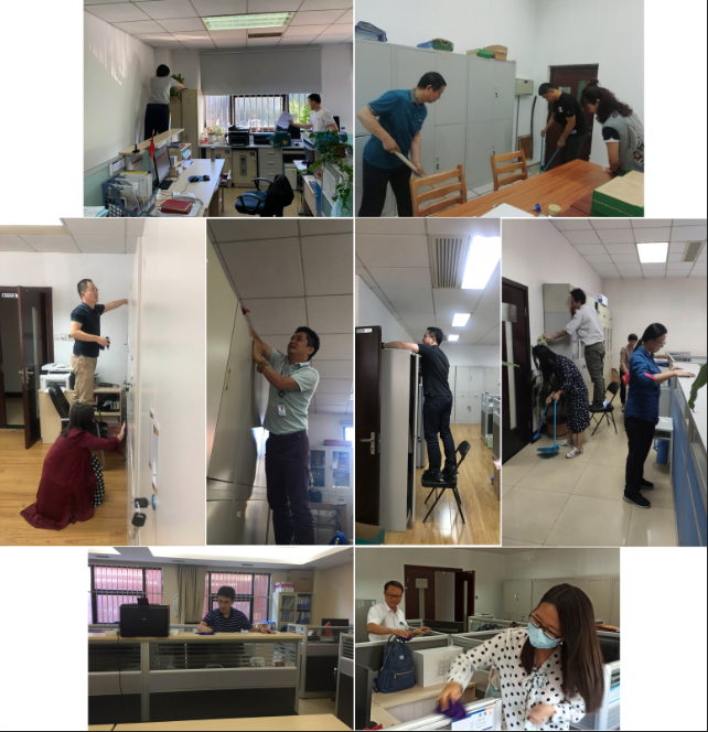 本次活动最主要的环节就是每周的卫生大扫除了,以各房间区域为小单元,每个区域由卫生责任人带头,大家干劲十足,看哪个房间打扫的好。在办公室里,职工、学生们通力合作,对各责任区域进行了彻底清理、不留死角。有的负责扫地拖地,有的负责擦拭工位与台面等。办公室日常地面保持的较为干净整洁,但由于办公室物品、书籍等资料较多,因此大家主要对柜顶等地废旧物品进行了整理与清洁,对桌面物品进行了归类摆放,使得整个办公室整齐划一,桌面、柜顶等处一尘不染,办公室的风貌焕然一新。