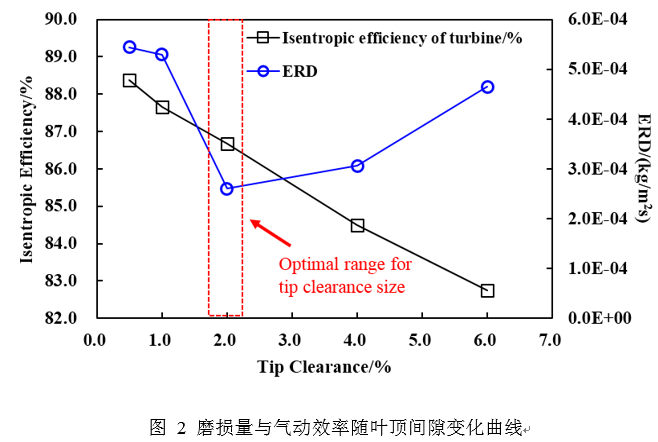 研究结果表明,静叶尾缘、动叶前缘及二者间的轮毂和轮盖表面的磨损量最大。随着叶顶间隙增加,叶片壁面磨损量具有先减少、后增大的变化特征,当叶顶间隙在2%出口叶高附近时,磨损量最低(见 2),确定了综合考虑气动效率和磨损量影响下向心涡轮最佳叶顶间隙取值范围;当向心涡轮膨胀比逐渐增加至2.02时,涡轮出口区壁面开始受粉尘影响,但叶轮前缘磨损范围显著缩小,此时向心涡轮等熵效率与最高值相比仅减小0.1%左右。基于上述研究成果,可以为向心涡轮防磨技术的工程应用提供指导,同时为压缩空气储能向心涡轮设计参数的确定提供参考。