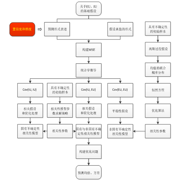 目前,无人飞行器实验室已经在随机代理模型建模方面开展了大量工作,以统计学理论为背景的梯度增强Stochastic Co-Kriging随机代理模型建模,同时以均方差积分为基础构建试验设计准则,发展基于该随机代理模型的试验设计方法,并将所构建方法运用于CFD非嵌入式不确定性量化问题,通过所构建随机代理模型精准高效的统计信息预测大幅缩减非嵌入式不确定性量化过程中的计算量,为基于CFD的不确定性研究提供有效手段和技术支撑。研究人员通过引入梯度和变置信度的概念研究了假设真值、估计形式、均方差的定义形式以及推导过程中假设的合理运用,建立了固有和非固有不确定性相关性模型(如图2),探索了相关性参数的求解方案和更为高效的梯度增强Stochastic Co-Kriging模型的构建方法等,研究了梯度增强Stochastic Co-Kriging模型预测能力及相关参数对结果的影响等。下一步拟构建三阶段序贯DOE方法,对初始化策略、预估方法、本阶段最终采样进行探索,同时开展基于所构建模型在验证算例和实际不确定性量化问题中的测试评估工作。