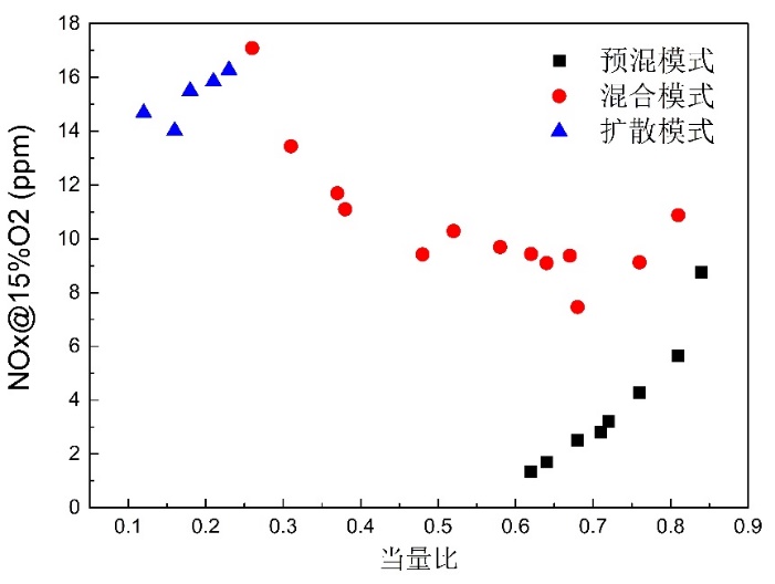 研究表明,该平行高速射流柔和燃烧器通过引入纯燃料射流,在部分预混掺混模式下可实现燃烧器熄火当量比的降低,燃料空气的预混程度仍是控制排放的关键因素。上述工作为后续的优化和柔和燃烧器扩稳的喷嘴布置提供了参考。