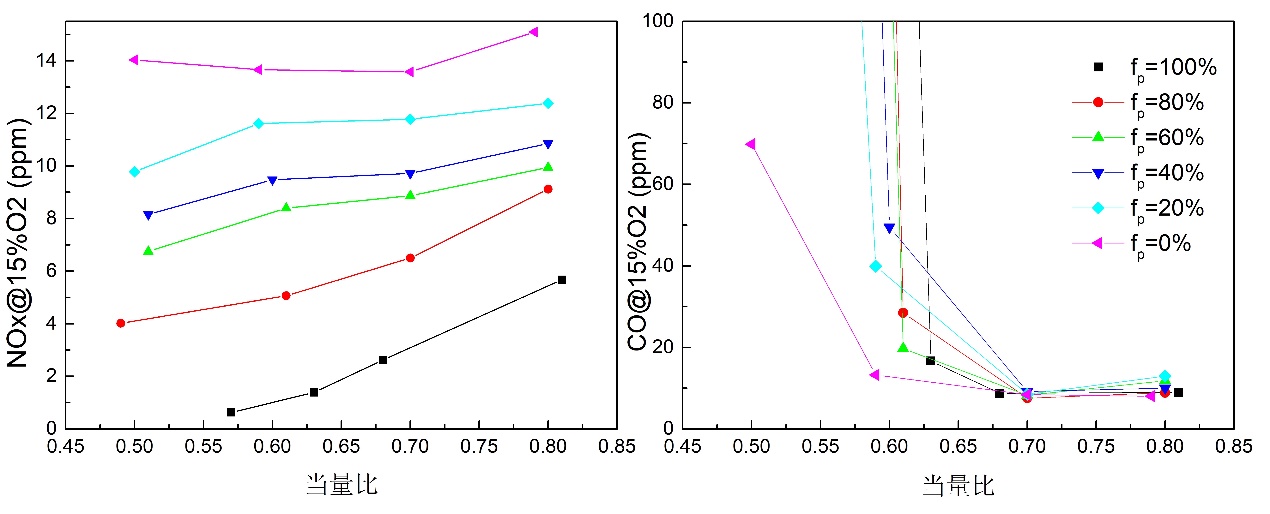 图 3预混喷嘴燃料占比对污染物排放的影响