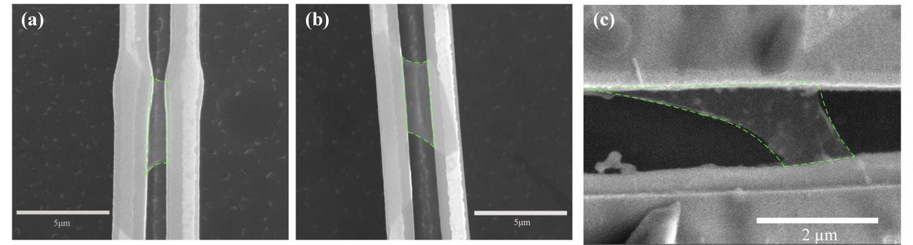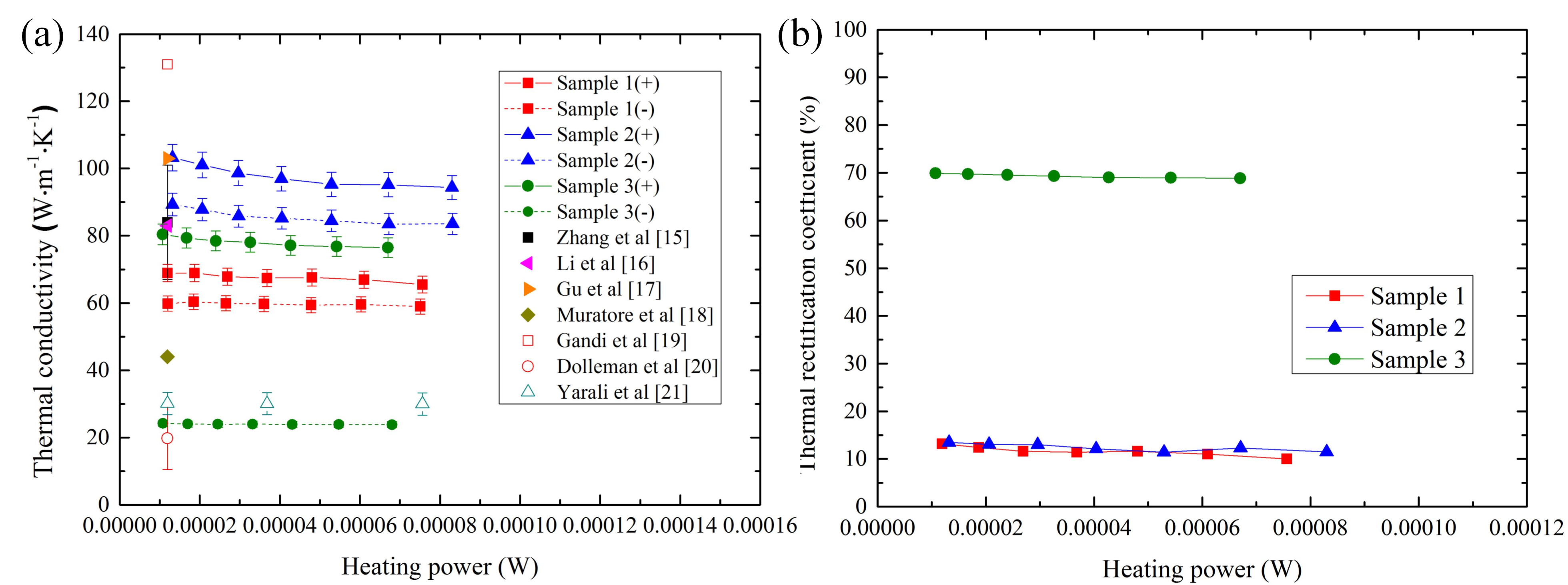 工程热物理研究所储能研发中心对二硫化钼薄膜的热导率测量及整流效应进行了深入研究。首先采用掩膜版光刻技术制备了一种可用于低维材料热导率测量的悬空微电极,如图1所示。结合谐波探测原理对单层硫化钼薄膜面向热导正反两向进行测量,并获得了热整流系数,如图2所示。结果显示三个单层二硫化钼样品的热导率与文献中的数值接近,其热整流系数值分别是10~13%,11~14%和69~70%。首次实验证实了热整流效应与加热功率无关,微/纳米结构的不对称性是实现热整流的重要原因。结合模拟计算揭示了硫化钼薄膜热整流效应与样品的不对称性之间的构效关系(图3所示),为二硫化钼薄膜在热整流器件及装置的设计和应用提供了重要基础和依据。