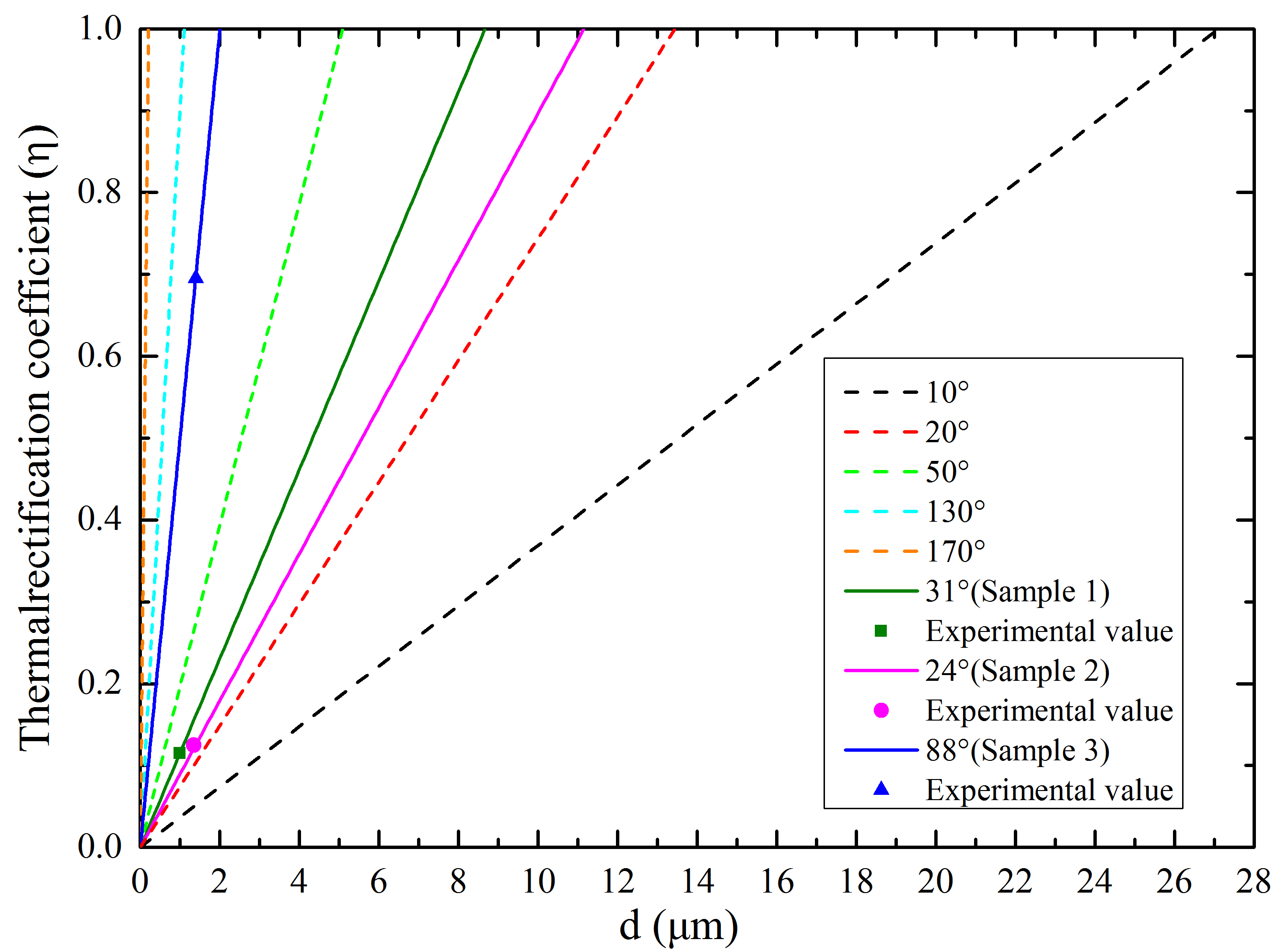 图3 不同角度的热整流系数及理论模型与实验结果的对比