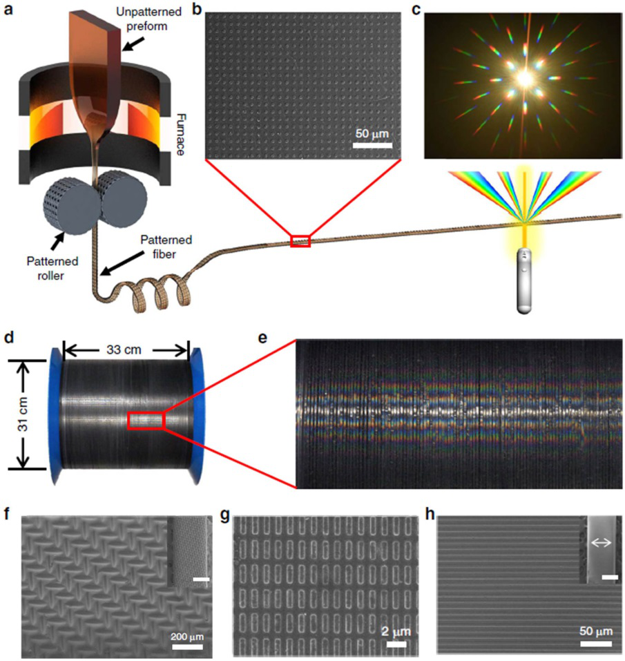 研究人员通过将预制棒在炉子内加热拉伸之后,直接用两个带有预设表面结构的滚轮作为模板,对刚拉制的纤维进行连续压印,使纤维表面形成连续的,与滚轮上表面结构相反的微纳结构。从电镜照片可以看出该工艺制作的表面结构质量非常高,与所用模板的结构完全吻合。并且清晰的衍射花样表明纤维表面的微纳结构呈现良好的周期性。随后,研究人员还展示了利用该工艺制作的多种表面结构和长达300米的具有表面结构的纤维。该工艺可适用于多种材料,并且不影响材料本身的机械性能。