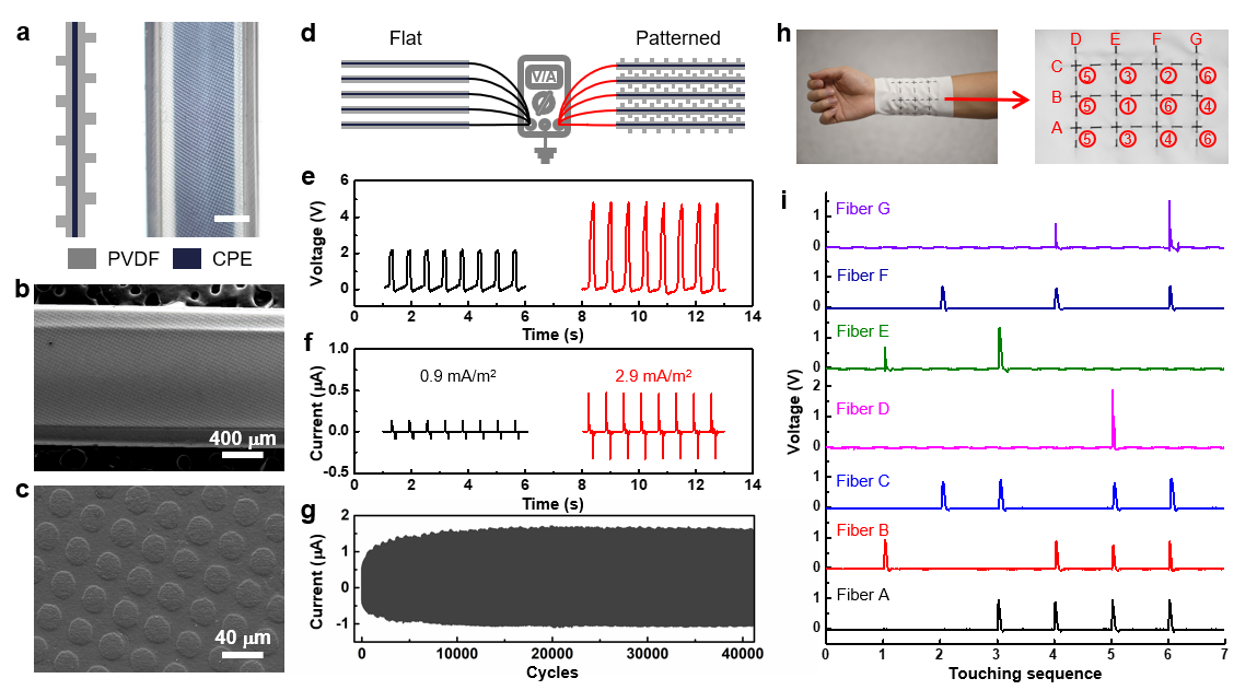 图二 应用于摩擦电纳米发电机和可穿戴多点触摸传感的图案化功能纤维