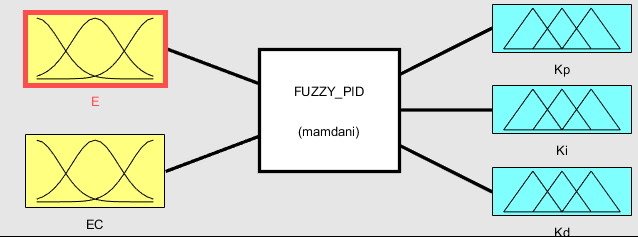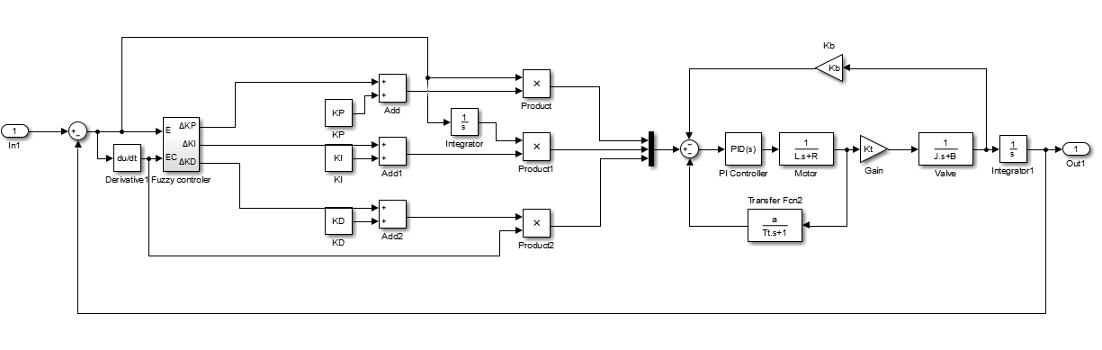 为了解决上述问题,研究人员采用了位置环+电流环的双闭环控制系统,把位置控制器的输出当作电流控制器的输入,再用电流控制器的输出去控制电机的运转。构建了旋转直驱阀控制系统模型(图2),其中电流环作为内环采用PI控制,其作用是保证电机快速加减速和对电流进行限幅,取较大的比例增益使系统的动态响应快,并通过适当的积分环节保证系统没有稳态误差;为了防止系统中高频电信号的干扰,反馈电路上设有一阶低通滤波器。位置环采用PID控制,并与模糊控制相结合,这样既具有PID控制精度高、稳定性好的优势,又具有模糊控制鲁棒性好、适应性强的特点。以阀芯角位移误差E和误差变化率EC作为输入,以PID控制参数的变化量ΔKP、ΔKI、ΔKD作为输出,采用模糊控制方法对系统进行控制参数的实时整定。选取7个模糊语言值(NBNMNSZOPSPMPB),作为输入和输出的模糊状态描述,三角形函数在论域范围内灵敏度较高,将其选作NMNSZOPSPM等中间模糊状态的隶属度函数。而NBPB选用高斯形隶属函数,以保证系统两端能够平滑过渡。模糊控制器隶属函数示意图如图3所示。