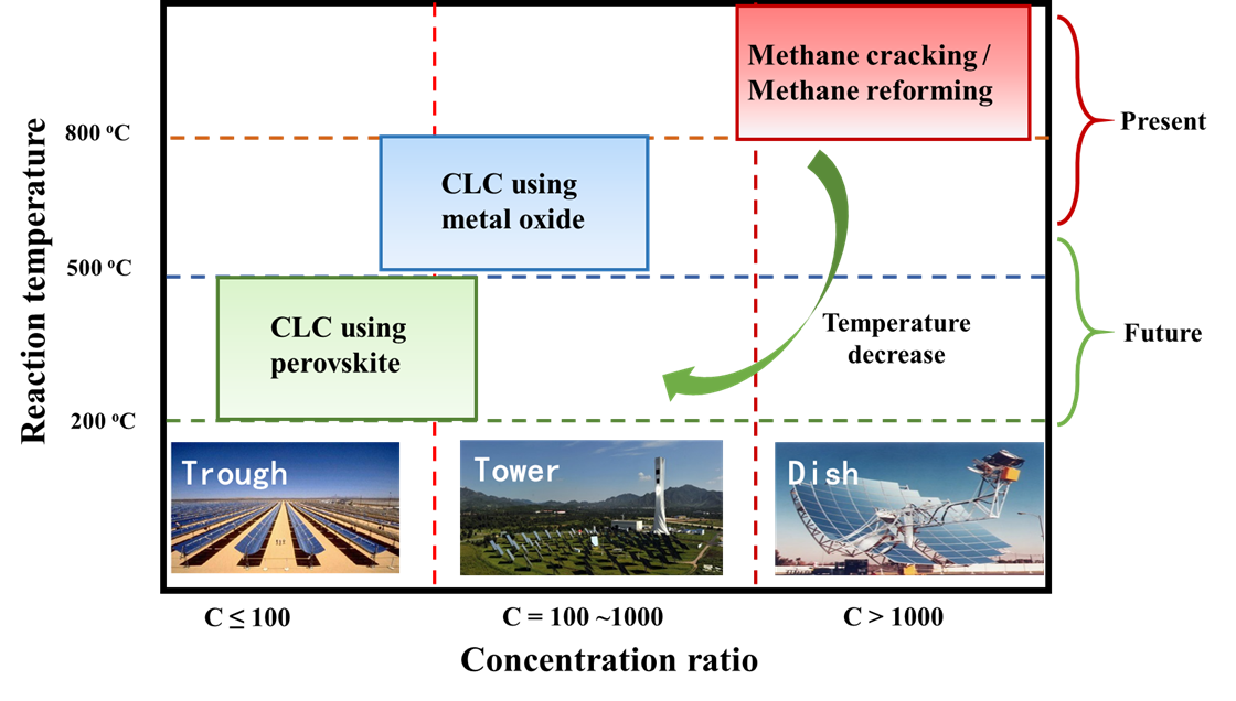 聚光太阳能可实现不同聚光比条件下驱动碳氢燃料参与的化学反应,实现太阳能互补系统的燃料转化。太阳能燃料制备的主要瓶颈是热化学循环反应温度高、辐射热损失大、不可逆损失严重,导致能量转换效率低。为解决该瓶颈,工程热物理研究所分布式供能与可再生能源实验室提出了聚光太阳能化学链循环方法。该方法主要原理如下:天然气在聚光太阳能作用下还原载氧体生成CO和H2,被还原的载氧体与空气等反应进行载氧体的再生,CO和H2即为所需的太阳能燃料。上述方法可将热化学反应温度从1000oC以上降低至600oC左右,不仅能降低太阳能集热岛的辐射热损失,还能降低热化学反应的不可逆损失,具有将太阳能利用效率提升约5~10%的潜力。