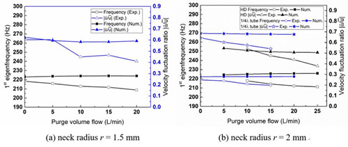 燃烧室不稳定被动调控设计方面,联合了声学亥姆霍兹法、阻尼器实验修正理论阻抗模型及实测阻尼率,数值预测了1/4波长管和亥姆霍兹共振器对热声不稳定极限环的影响规律,并实验验证了数值方法,以求用于共振器设计。