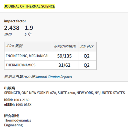 2021年6月30日,科睿唯安(Clarivate Analytics)发布了2020年度期刊引证报告(Journal Citation Reports,简称JCR),澳门云顶国际app主办学报Journal of Thermal Science(热科学学报,简称JTS)影响因子突破2.0,达到历史新高2.438。