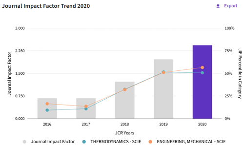 继上一年度期刊影响因子1.972以来,本年度JTS的影响因子达到历史新高2.438,比上一年度增长了23.6%,五年影响因子上升至1.9,比上一年度增长33.2%;在“THERMODYNAMICS”和“ENGINEERING, MECHANICAL”领域的期刊排名均在Q2区。