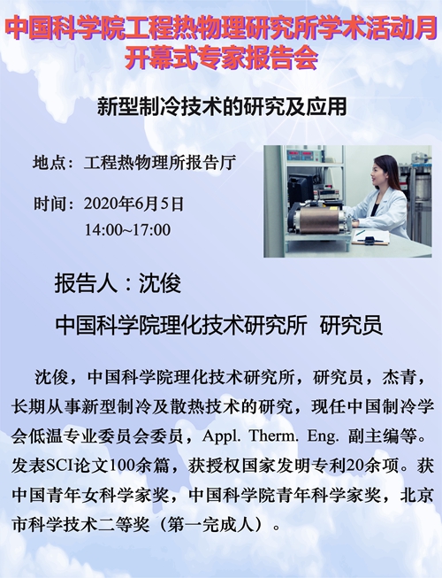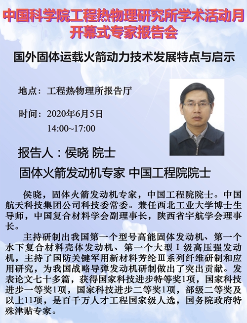 为搭建高层次的学术交流平台,促进科研人员及研究生学术互动和学术创新,6月份将举办2020年度工程热物理研究所学术活动月,将有专家报告会、仪器研制创新论坛、青年学者论坛、研究生论坛、博士后学术论坛等一系列学术活动。首场开幕式专家报告会已定于6月5日(本周五)下午14点在报告厅举办,同时在廊坊基地设有分会场。特邀中国工程院院士侯晓和杰青获得者沈俊两位专家作学术报告。